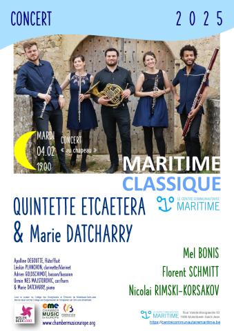 Le Quintette EtCaetera est l'une des formations très proches de Chamber Music for Europe. Bientôt dix ans d'échanges, de collaborations, de moment partagés autour de leur vaste répertoire qui contient nombres d'œuvres à découvrir. Ce soir, la rencontre avec Marie Datcharry offrira une autre perspective sur le répertoire de musique de chambre : le dialogue subtil entre le piano et les sonorités si variées des vents. Nous sommes heureux de retrouver Marie avec qui CME à beaucoup collaboré à l'époque du Quatuor Kaliště .